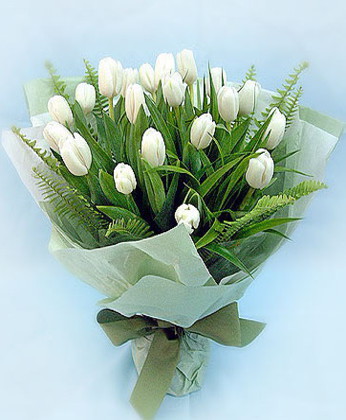 商品簡(jiǎn)介:白色郁金香22枝 排草 商品包裝:淡綠色包裝紙,緞帶裹扎