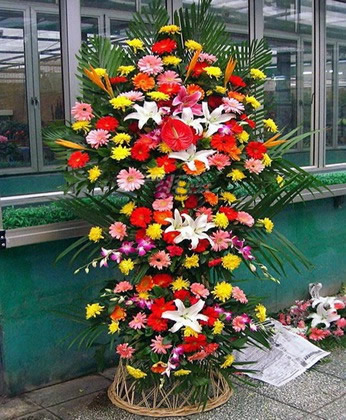 材料包裝: 紅掌 白色多頭百合 扶郎 天堂鳥 黃鶯 綠葉 商品包裝:3層,2米高花籃