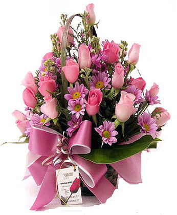 粉玫瑰30枝 各色小菊 黃鶯 龜背葉 商品包裝:精美小花籃,大蝴蝶結