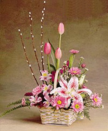 商品簡介:粉色多頭百合1枝 紅色郁金香3枝 扶郎10枝 綠葉 黃鶯 商品包裝:花籃