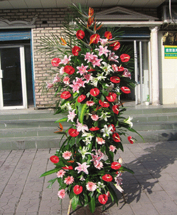 紅掌 白色多頭百合 粉色多頭百合 天堂鳥 扶郎 綠葉 黃鶯 商品包裝:2米高豪華花籃 開業花籃