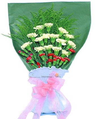商品簡介:白色康乃馨15枝 紅色康乃馨10枝 黃鶯 商品包裝:皺紋紙扇形包裝