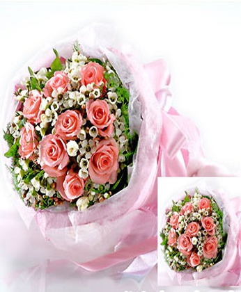 粉玫瑰9枝 滿天星 綠葉 商品包裝:粉色棉紙圓形包裝