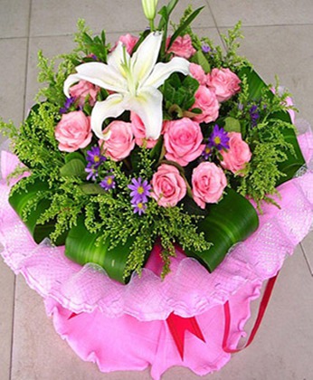 商品簡(jiǎn)介:白色多頭百合1枝 粉玫瑰11枝 黃鶯 綠葉 商品包裝:卷邊紙經(jīng)典圓形包裝