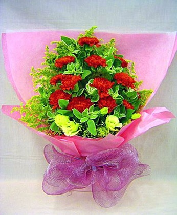 商品簡介:紅色康乃馨12枝 黃鶯 滿天星 商品包裝:粉色皺紋紙扇形包裝