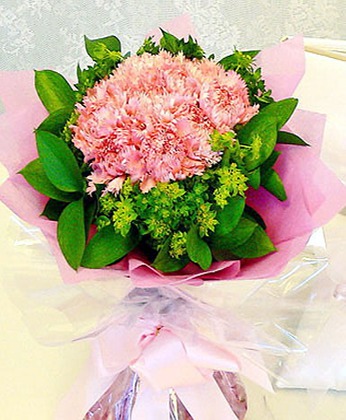商品簡介:粉色康乃馨19枝 黃鶯 綠葉 商品包裝:皺紋紙圓形包裝