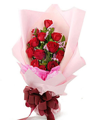 商品簡介:紅玫瑰11枝 勿忘我(配花) 梔子葉(配花) 商品包裝:粉色皺紋紙扇型包裝