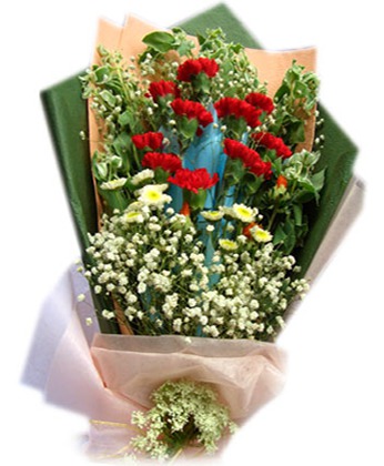 商品簡介:紅色康乃馨10枝 滿天星 綠葉 商品包裝:皺紋紙扇形包裝