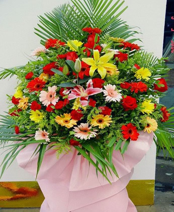商品簡介:粉色多頭百合 扶郎 黃鶯 綠葉 商品包裝:單層1.8米高花籃