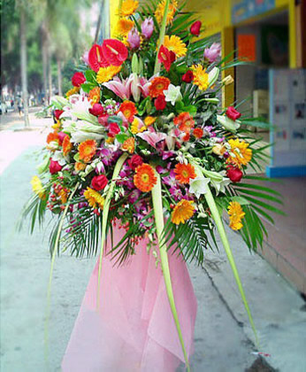 商品簡(jiǎn)介:紅掌 粉色多頭百合 紅玫瑰 扶郎 紫色洋蘭 散尾葉 黃鶯 劍葉 商品包裝:?jiǎn)螌?.8米高花籃 開業(yè)花籃