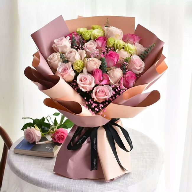 33朵各色玫瑰混搭,6朵綠色洋桔梗間插,高檔包裝。