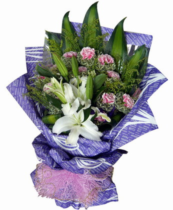 商品簡介:粉色康乃馨12枝 白色多頭百合2枝 滿天星 劍葉 商品包裝:紫色皺紋紙扇形包裝