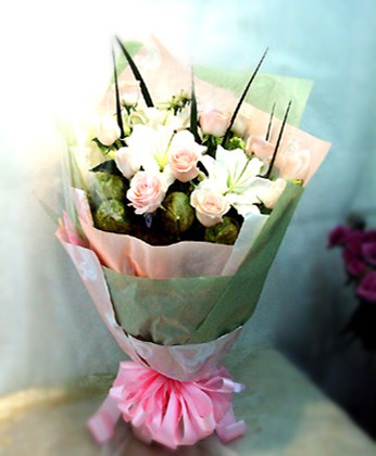商品簡介:粉玫瑰11枝 白色多頭百合2枝 時尚配花 商品包裝:皺紋紙港式包裝