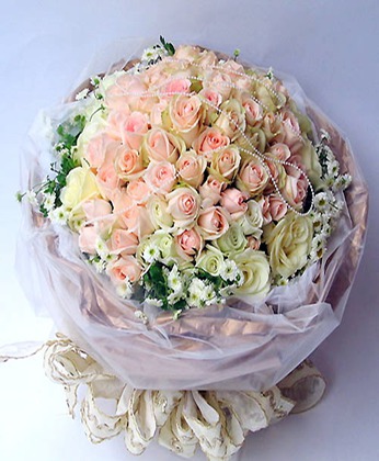 香檳玫瑰66枝 滿天星 綠葉 商品包裝:白色薄紗,皺紋紙圓形包裝
