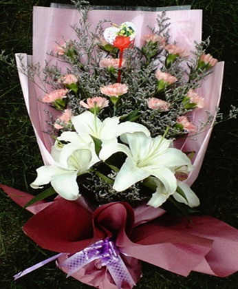 粉色康乃馨12枝 白色多頭百合2枝 情人草 綠葉 商品包裝:皺紋紙單面包裝