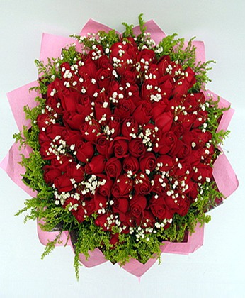 紅玫瑰99枝 滿天星 黃鶯 商品包裝:內襯淡色棉紙,外層粉色皺紋紙圓形包裝