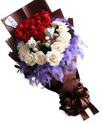紅玫瑰11枝 白玫瑰11枝 梔子葉 兩只小熊 商品包裝:外圍紫色羽毛,深色皺紋紙單面包裝