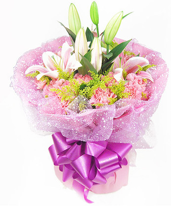 商品簡介:粉色多頭百合2枝 粉色康乃馨12支黃鶯 商品包裝:里層淺色網紗,外圍紫色卷邊紙包圓形