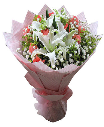 商品簡介:粉玫瑰11枝 白色多頭百合3枝 滿天星 黃鶯 商品包裝:粉色皺紋紙圓形包裝