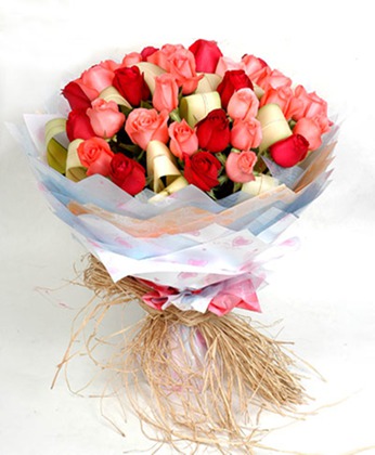 商品簡介:紅玫瑰12枝 粉玫瑰21枝 綠葉 商品包裝:皺紋紙圓形包裝