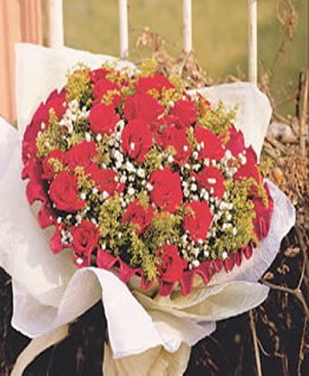 商品簡介:紅玫瑰33枝 黃鶯 滿天星 商品包裝:卷邊紙經典圓形包裝