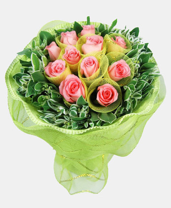 粉玫瑰11枝(每枝網(wǎng)紗單獨(dú)包裝) 葉上花 商品包裝:內(nèi)用淺綠色卷邊紙,外圍淺色網(wǎng)紗圓形包裝