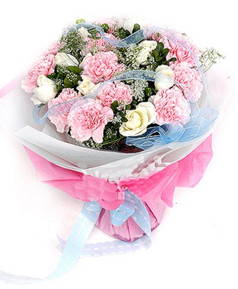 商品簡介:粉色康乃馨12枝 白玫瑰6枝 滿天星 綠葉 商品包裝:棉紙圓形包裝