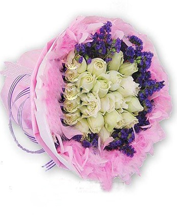 商品簡介:白玫瑰20枝 勿忘我 商品包裝:內襯粉色棉紙,外層皺紋紙圓形包裝