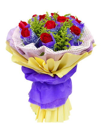 11枝紅玫瑰獨立包裝,黃英間插豐滿。 商品包裝:紫色學(xué)點網(wǎng)紗獨立包裝,粉色紗網(wǎng)圍邊,粉色、黃色瓦楞紙多層包裝,紫色棉紙束扎