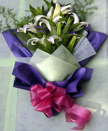 商品簡介:白色多頭百合6枝 勿忘我 天門冬 商品包裝:皺紋紙單面包裝