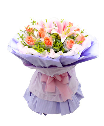 商品簡(jiǎn)介:粉玫瑰11枝 粉色多頭百合2枝 黃鶯 商品包裝:淡紫色皺紋紙圓形精美包裝,粉色紗網(wǎng)圍邊,粉色絲帶