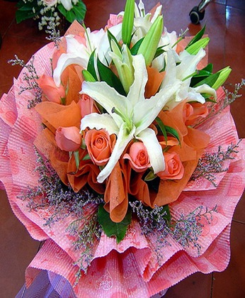 白色多頭百合3枝 粉玫瑰10枝 情人草 綠葉 商品包裝:粉紅色皺紋紙圓形包裝