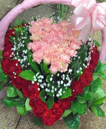 商品簡介:粉色康乃馨19枝 紅色康乃馨29枝 滿天星(配花) 梔子葉(配花) 商品包裝:心形精美花籃