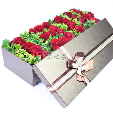 商品簡介:33支紅玫瑰,搭配綠葉,擺出“1314”造型,禮盒包裝