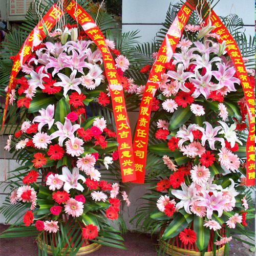 材料包裝: 材料:粉百合,各色扶郎花,紅玫瑰,巴西葉,散尾葵葉搭配。3層1.8高,備注:價格是一個花籃價格。 包裝:開業花籃 花語: 蒸蒸日上, 紅紅火火, 附送: 免費附送精美賀卡,代寫您的祝福。(您下單時可填寫留言欄)