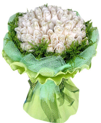 材料包裝: 白玫瑰50枝 黃鶯 商品包裝:內(nèi)圍淺綠色網(wǎng)紗,外圍綠色卷邊紙包圓形
