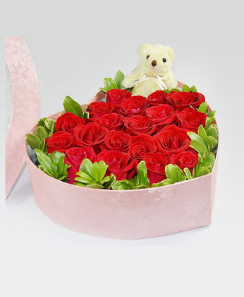 紅玫瑰19枝 梔子葉 外加一小熊 商品包裝:精美心形禮盒包裝