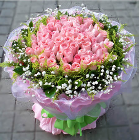 商品簡介:粉玫瑰99枝 綠葉 商品包裝:內(nèi)襯棉紙,皺紋紙圓形包裝