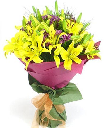 商品簡介:黃色多頭百合12枝 時尚配花 綠葉 商品包裝:皺紋紙圓形包裝