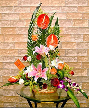 商品簡介:紅掌2枝 粉色多頭百合2枝 粉玫瑰12枝 黃鶯 綠葉 商品包裝:精美桌面小花籃