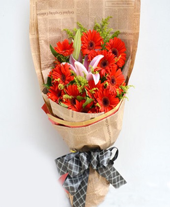 扶郎12枝 粉色多頭百合1枝 黃鶯(配花) 商品包裝:土黃色印花英文報(bào)紙(或用同色皺紋紙)單面精美包裝