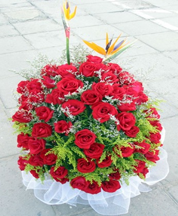 材料包裝: 天堂鳥2枝 紅玫瑰50枝 黃鶯 情人草 商品包裝:白色紗網圓形包裝