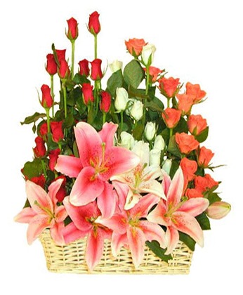 商品簡介:粉色多頭百合3枝 紅玫瑰19枝 粉玫瑰19枝 白玫瑰19枝 綠葉 黃鶯 商品包裝:精美花籃
