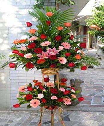 商品簡介:粉色多頭百合 紅玫瑰 扶郎 黃鶯 綠葉 商品包裝:2層1.8米左右高開業(yè)花籃