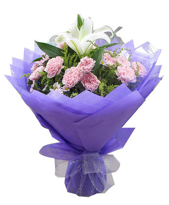 商品簡介:白色多頭百合2枝 粉色康乃馨12枝 黃鶯 商品包裝:淺紫色皺紙包扎、圓形花束