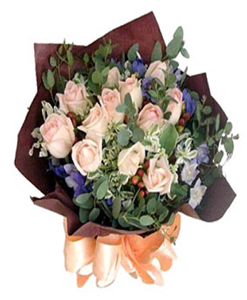 商品簡介:香檳玫瑰11枝 綠葉 勿忘我 商品包裝:皺紋紙包裝