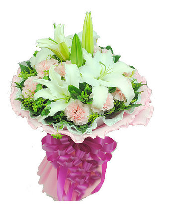 商品簡介:白色多頭百合3枝 粉色康乃馨12枝 黃鶯 葉上黃金 商品包裝:粉色卷邊紙包圓形,紫色蝴蝶結