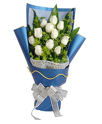 商品簡介:白玫瑰11枝 葉上黃金 巴西葉 商品包裝:里層淺色網紗,外圍藍色皺紋紙單面包裝