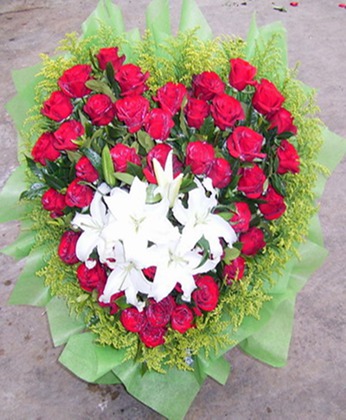 紅玫瑰33枝 白色多頭百合3枝 黃鶯 商品包裝:綠色棉紙圓形包裝