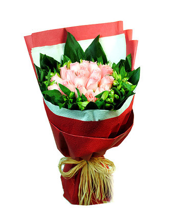 粉玫瑰20枝 黃鶯 巴西葉 商品包裝:里面淺色皺紋紙包圍紅色皺紋紙單面包